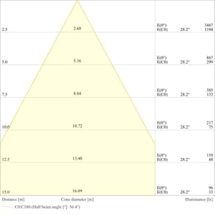 De gradenbundel geeft informatie over hoe breed het licht wordt uitgestraald. Dit zit tussen de 0 en 360 graden (D). Hoe kleiner de hoek, hoe specifieker de lichtbundel is. Over het algemeen is een smalle gradenbundel perfect voor sfeer- of accentverlichting, terwijl een brede gradenbundel ideaal is om grote oppervlaktes te verlichten.
